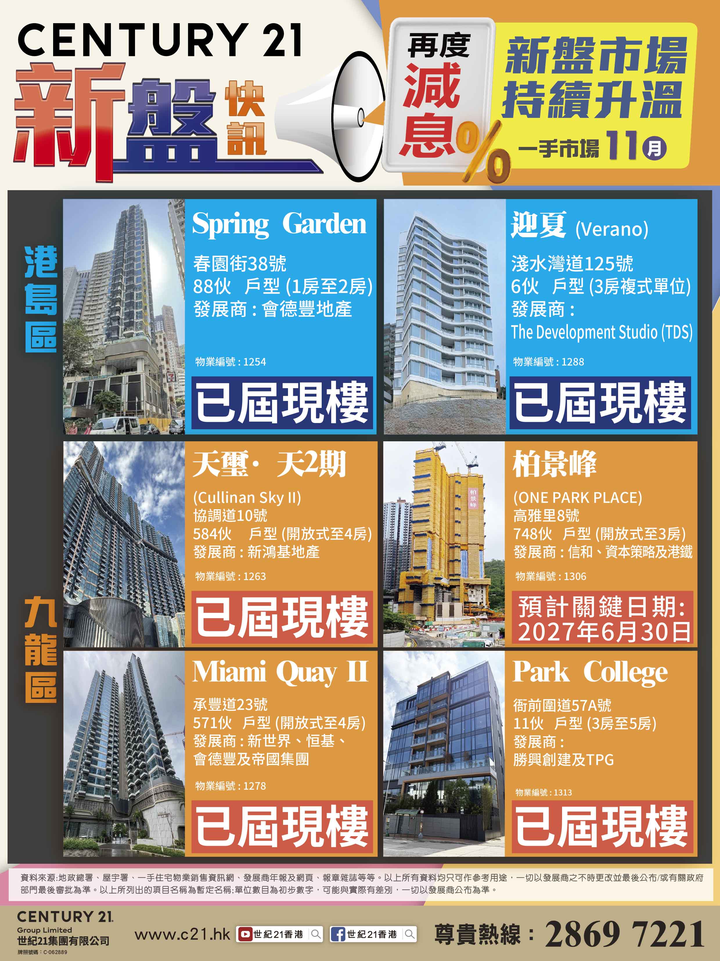 今日早上有大型銀行推出全新的定息按揭優惠,首五年息率低見3.03厘,反映銀行亦預期減息周期仍會持續,亦反映銀行有意加快搶佔按揭市場份額,雖然過去一年樓市已全面撤辣並將按揭成數回歸至七成,政府可進一步放寬基本按揭成數由七成升至八成,甚至九成。世紀21香港有限公司行政總裁吳啟民坦言,放寬按揭可進一步協助用家入市,亦可吸引全球華人將資金投入香港樓市,預計今年上半年樓價仍會維持橫行,但隨著整體經濟復甦、新盤存量回落,相信今年下半年整體樓價可擺脫過去幾年的整固期,成功見底回升,升幅更可達至一成水平。