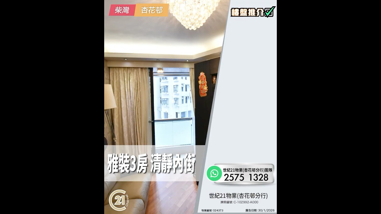 雅裝3房 清靜內街 | 柴灣 杏花邨👉🏻 https://url.c21.hk/024373 柴灣 杏花邨 23 座 實用面積: 600 呎 電話號碼: 📞2575 1328 (世紀21物業(杏花邨分行)團隊) 世紀21物業(杏花邨分行) 牌照編號: C-102992-A000 物業編號: 024373 廣告日期: 30/1/2026 📲whatsapp查詢:https://url.c21.hk/wts #柴灣 #杏花邨 #內街 #二手樓盤 #落區睇樓 #一手 #二手 #上車 #租務 #世紀21香港 #世紀21 #C21 #Century21 #21channel #21頻道 ---------------------------------------------------- 📍設定「搶先看」樓盤資訊即時收看📍 🔎世紀21香港官網 👉 https://c21.hk/ 🖥世紀21香港Facebook👉 https://url.c21.hk/fb 📞聯絡查詢:28697221 🔻讚好🔻訂閱🔻分享🔻LIKE🔻FOLLOW🔻SHARE ---------------------------------------------------- *以上的樓盤資料,由特許經營商提供及擁有,而每辦事處乃獨立擁有及經營(Each CENTURY 21 Office Is Independently Owned and Operated)。由於資料並非實時同步擷取,不確保樓盤廣告能反映樓盤的最新狀態,只僅作參考用途。若有錯漏而引致任何不便及損失,請直接向有關特許經營商或分行查詢,世紀21香港概不負責。