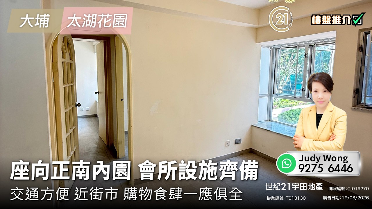 樓盤推介:座向正南內園 會所設施齊備 交通方便 近街市 購物食肆一應俱全 | 大埔 太湖花園 | More Details 👉🏻 https://url.c21.hk/T013130 大埔 太湖花園 (租/售) 實用面積: 400 呎 電話號碼: 9275 6446 (Judy 黃小姐) 世紀21宇田地產 牌照編號: :C-019270 物業編號: T013130 廣告日期: 10/03/2026 📲whatsapp查詢:https://url.c21.hk/wts #大埔 #太湖花園 #內園 #2房 #交通方便 #二手樓盤 #落區睇樓 #一手 #二手 #上車 #租務 #世紀21香港 #世紀21 #C21 #Century21 #21channel #21頻道 ---------------------------------------------------- 📍設定「搶先看」樓盤資訊即時收看📍 🔎世紀21香港官網 👉 https://c21.hk/ 🖥世紀21香港Facebook👉 https://url.c21.hk/fb 📞聯絡查詢:28697221 🔻讚好🔻訂閱🔻分享🔻LIKE🔻FOLLOW🔻SHARE ---------------------------------------------------- *以上的樓盤資料,由特許經營商提供及擁有,而每辦事處乃獨立擁有及經營(Each CENTURY 21 Office Is Independently Owned and Operated)。由於資料並非實時同步擷取,不確保樓盤廣告能反映樓盤的最新狀態,只僅作參考用途。若有錯漏而引致任何不便及損失,請直接向有關特許經營商或分行查詢,世紀21香港概不負責。
