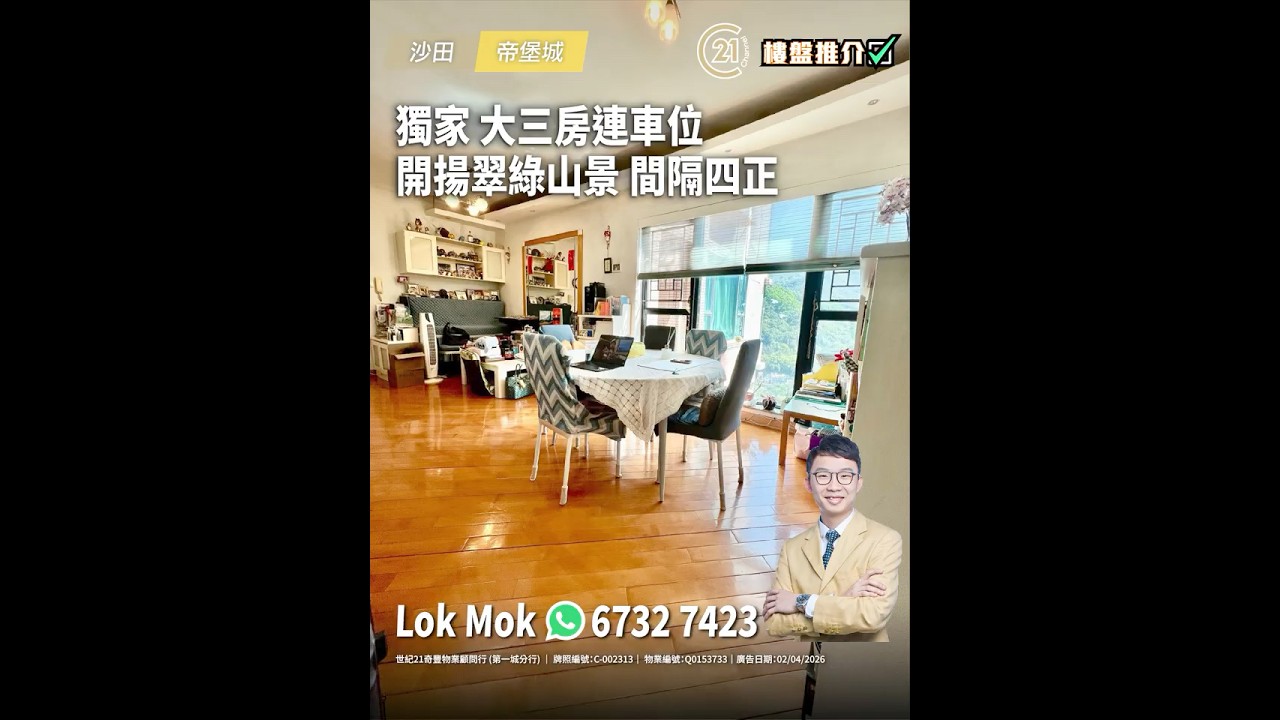 樓盤推介:獨家 大三房連車位 開揚翠綠山景 間隔四正 | 沙田 帝堡城 沙田 帝堡城 實用面積: 901 呎 電話號碼: 6732 7423 (Lok Mok) 更多物業資訊:https://url.c21.hk/Q0153733 世紀21奇豐物業顧問行(第一城分行) 牌照編號: C-002313 物業編號: Q0153733 廣告日期: 02/04/2026 📲whatsapp查詢:https://url.c21.hk/wts #沙田 #帝堡城 #山景 #連車位 #開揚 #3房 #方便 #二手樓盤 #落區睇樓 #一手 #二手 #上車 #租務 #世紀21香港 #世紀21 #C21 #Century21 #21channel #21頻道 ======================================= 世紀21香港官網:https://c21.hk/ 世紀21香港Facebook專頁:https://url.c21.hk/fb 世紀21按揭計算機:https://url.c21.hk/mortgagecaulator --------------------------------------------------- *以上的樓盤資料,由特許經營商提供及擁有,而每辦事處乃獨立擁有及經營(Each CENTURY 21 Office Is Independently Owned and Operated)。由於資料並非實時同步擷取,不確保樓盤廣告能反映樓盤的最新狀態,只僅作參考用途。若有錯漏而引致任何不便及損失,請直接向有關特許經營商或分行查詢,世紀21香港概不負責。 =======================================