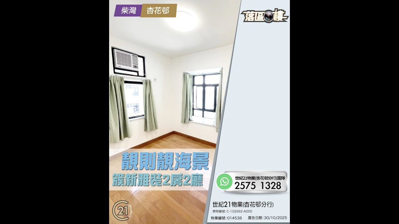 落區睇樓 🏠 靚則享靚海景,簇新雅裝2房2廳,間隔方正,容易擺放傢俱!近海旁,環境優美,近地鐵站又有商場,自成一隅,滿足生活基本需求 👉🏻 https://url.c21.hk/014538 柴灣 杏花邨 實用面積:499呎 電話號碼:📞2575 1328 ( 世紀21物業(杏花邨分行)團隊 ) 世紀21物業(杏花邨分行) 牌照編號:C-102992-A000 物業編號:014538 廣告日期:30/10/2025 📲whatsapp查詢:https://url.c21.hk/wts #柴灣 #杏花邨 #靚則 #海景 #二手樓盤 #落區睇樓 #一手 #二手 #上車 #租務 #世紀21香港 #世紀21 #C21 #Century21 #21channel #21頻道 ---------------------------------------------------- 📍設定「搶先看」樓盤資訊即時收看📍 🔎世紀21香港官網 👉 https://c21.hk/ 🖥世紀21香港Facebook👉 https://url.c21.hk/fb 📞聯絡查詢:28697221 🔻讚好🔻訂閱🔻分享🔻LIKE🔻FOLLOW🔻SHARE ---------------------------------------------------- *以上的樓盤資料,由特許經營商提供及擁有,而每辦事處乃獨立擁有及經營(Each CENTURY 21 Office Is Independently Owned and Operated)。由於資料並非實時同步擷取,不確保樓盤廣告能反映樓盤的最新狀態,只僅作參考用途。若有錯漏而引致任何不便及損失,請直接向有關特許經營商或分行查詢,世紀21香港概不負責。