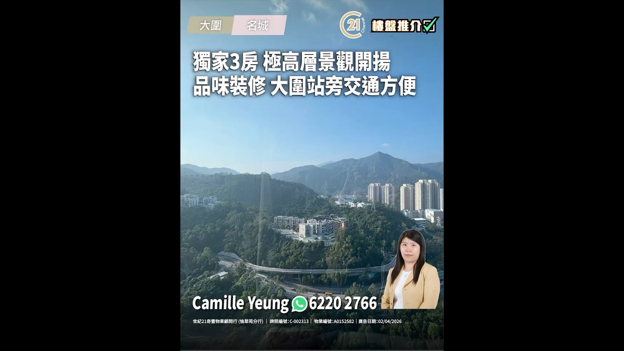 樓盤推介:獨家3房 極高層景觀開揚 品味裝修 大圍站旁交通方便 | 大圍 名城 大圍 名城 實用面積: 785 呎 電話號碼: 6220 2766 (Camille Yeung) 更多物業資訊:https://url.c21.hk/A0152582 世紀21奇豐物業顧問行(愉翠苑分行) 牌照編號: C-002313 物業編號: A0152582 廣告日期: 02/04/2026 📲whatsapp查詢:https://url.c21.hk/wts #大圍 #名城 #開揚景 #港鐵站 #圍方 #柏傲莊 #3房 #方便 #二手樓盤 #落區睇樓 #一手 #二手 #上車 #租務 #世紀21香港 #世紀21 #C21 #Century21 #21channel #21頻道 ======================================= 世紀21香港官網:https://c21.hk/ 世紀21香港Facebook專頁:https://url.c21.hk/fb 世紀21按揭計算機:https://url.c21.hk/mortgagecaulator --------------------------------------------------- *以上的樓盤資料,由特許經營商提供及擁有,而每辦事處乃獨立擁有及經營(Each CENTURY 21 Office Is Independently Owned and Operated)。由於資料並非實時同步擷取,不確保樓盤廣告能反映樓盤的最新狀態,只僅作參考用途。若有錯漏而引致任何不便及損失,請直接向有關特許經營商或分行查詢,世紀21香港概不負責。 =======================================