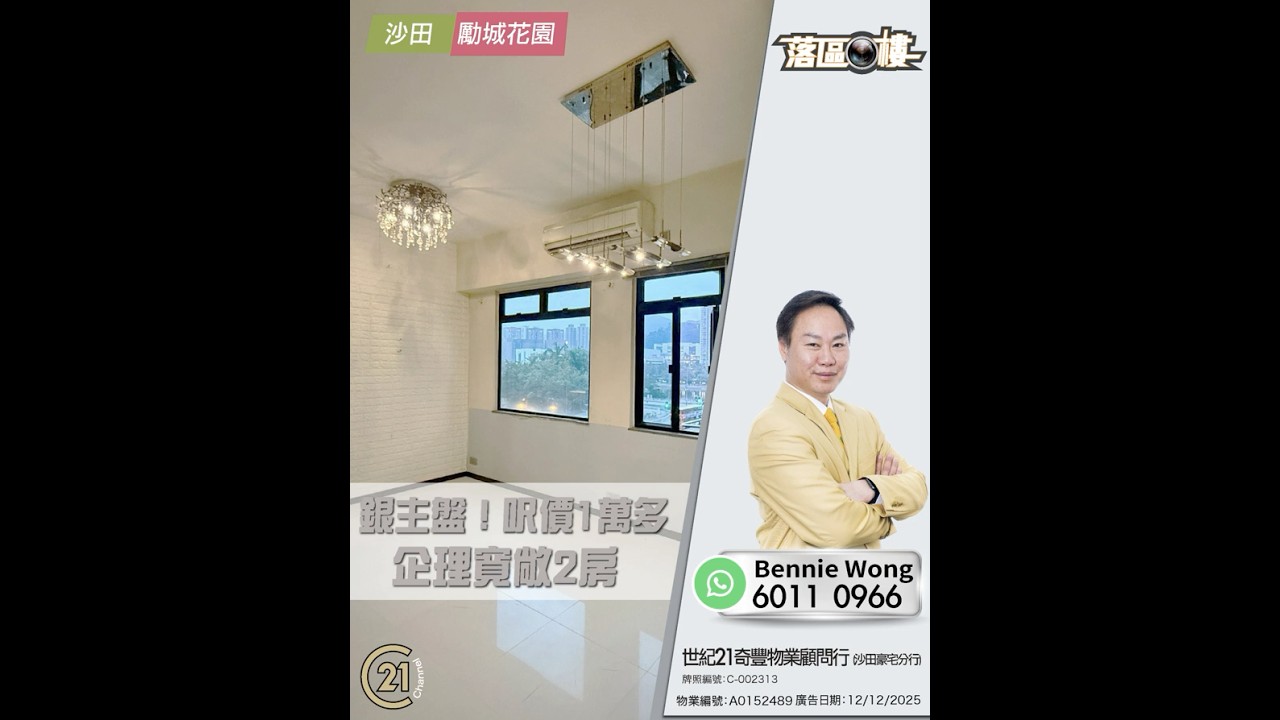 落區睇樓 🏠 銀主盤精選,呎價約1萬多!鄰近沙田圍站,企理方正2房,改開放式廚房,讓整體廳區更加寬敞,望開揚景觀! 👉🏻 https://url.c21.hk/A0152489 沙田 勵城花園 實用面積:426呎 電話號碼:📞6011 0966 (Bennie Wong) 世紀21奇豐物業顧問行 (沙田豪宅分行) 牌照編號:C-002313 物業編號:A0152489 廣告日期:12/12/2025 📲whatsapp查詢:https://url.c21.hk/wts #沙田 #勵城花園 #銀主盤 #沙田圍 #二手樓盤 #落區睇樓 #一手 #二手 #上車 #租務 #世紀21香港 #世紀21 #C21 #Century21 #21channel #21頻道 ---------------------------------------------------- 📍設定「搶先看」樓盤資訊即時收看📍 🔎世紀21香港官網 👉 https://c21.hk/ 🖥世紀21香港Facebook👉 https://url.c21.hk/fb 📞聯絡查詢:28697221 🔻讚好🔻訂閱🔻分享🔻LIKE🔻FOLLOW🔻SHARE ---------------------------------------------------- *以上的樓盤資料,由特許經營商提供及擁有,而每辦事處乃獨立擁有及經營(Each CENTURY 21 Office Is Independently Owned and Operated)。由於資料並非實時同步擷取,不確保樓盤廣告能反映樓盤的最新狀態,只僅作參考用途。若有錯漏而引致任何不便及損失,請直接向有關特許經營商或分行查詢,世紀21香港概不負責。