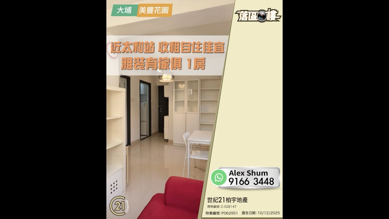 落區睇樓 🏠 收租自住佳宜!近太和站及設有商場,配套便利,十分受留學生歡迎!雅裝有傢俱,實用1房2廳 👉🏻 https://url.c21.hk/P062951 大埔 美豐花園 實用面積:296呎 電話號碼:📞9166 3448 (Alex Shum) 世紀21柏宇地產 牌照編號:C-028147 物業編號:P062951 廣告日期:10/12/2025 📲whatsapp查詢:https://url.c21.hk/wts #大埔 #美豐花園 #太和站 #收租 #自住 #二手樓盤 #落區睇樓 #一手 #二手 #上車 #租務 #世紀21香港 #世紀21 #C21 #Century21 #21channel #21頻道 ---------------------------------------------------- 📍設定「搶先看」樓盤資訊即時收看📍 🔎世紀21香港官網 👉 https://c21.hk/ 🖥世紀21香港Facebook👉 https://url.c21.hk/fb 📞聯絡查詢:28697221 🔻讚好🔻訂閱🔻分享🔻LIKE🔻FOLLOW🔻SHARE ---------------------------------------------------- *以上的樓盤資料,由特許經營商提供及擁有,而每辦事處乃獨立擁有及經營(Each CENTURY 21 Office Is Independently Owned and Operated)。由於資料並非實時同步擷取,不確保樓盤廣告能反映樓盤的最新狀態,只僅作參考用途。若有錯漏而引致任何不便及損失,請直接向有關特許經營商或分行查詢,世紀21香港概不負責。