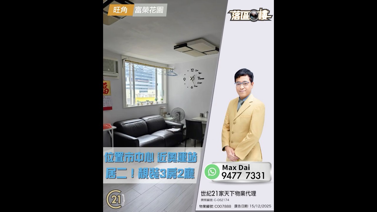 落區睇樓 🏠 市區居屋盤!近奧運站及有大型商場,居二靚裝3房2廳,可以即買即住,望開揚景觀,更加遠眺港島景色! 👉🏻 https://url.c21.hk/C007888 旺角 富榮花園 實用面積:484呎 電話號碼:📞9477 7331 (Max Dai) 世紀21家天下物業代理 牌照編號:C-062174 物業編號:C007888 廣告日期:15/12/2025 📲whatsapp查詢:https://url.c21.hk/wts #旺角 #富榮花園 #居屋 #奧運站 #居二 #開揚景 #二手樓盤 #落區睇樓 #一手 #二手 #上車 #租務 #世紀21香港 #世紀21 #C21 #Century21 #21channel #21頻道 ---------------------------------------------------- 📍設定「搶先看」樓盤資訊即時收看📍 🔎世紀21香港官網 👉 https://c21.hk/ 🖥世紀21香港Facebook👉 https://url.c21.hk/fb 📞聯絡查詢:28697221 🔻讚好🔻訂閱🔻分享🔻LIKE🔻FOLLOW🔻SHARE ---------------------------------------------------- *以上的樓盤資料,由特許經營商提供及擁有,而每辦事處乃獨立擁有及經營(Each CENTURY 21 Office Is Independently Owned and Operated)。由於資料並非實時同步擷取,不確保樓盤廣告能反映樓盤的最新狀態,只僅作參考用途。若有錯漏而引致任何不便及損失,請直接向有關特許經營商或分行查詢,世紀21香港概不負責。