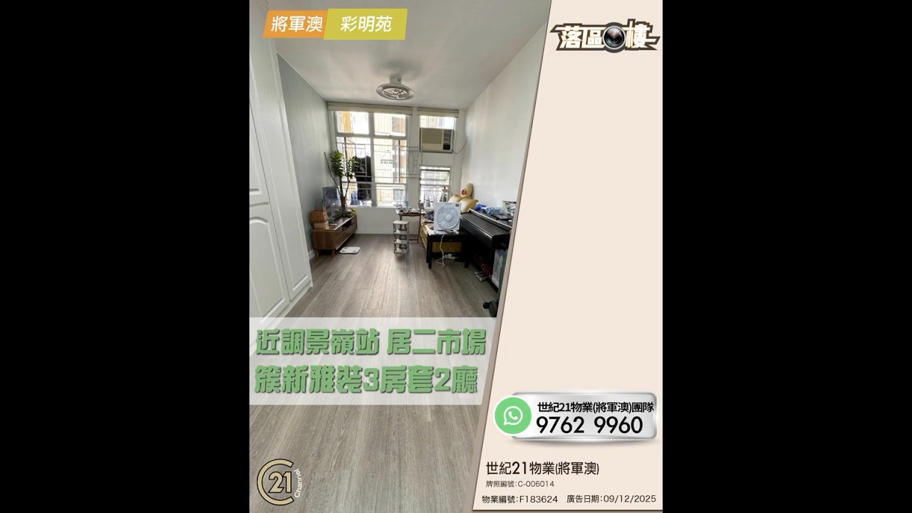 落區睇樓 🏠 鄰近港鐵調景嶺站,附近有商場,配套方便!居二市場,簇新雅裝3房1套2廳,間隔實用,單位保養得宜,可以即買即住,大大減省裝修費用 👉🏻 https://url.c21.hk/F183624 將軍澳 彩明苑 實用面積:650呎 電話號碼:📞9762 9960 ( 世紀21物業(將軍澳)團隊 ) 世紀21物業(將軍澳) 牌照編號:C-006014 物業編號:F183624 廣告日期:09/12/2025 📲whatsapp查詢:https://url.c21.hk/wts #將軍澳 #彩明苑 #調景嶺 #即買即住 #居二 #居屋 #二手樓盤 #落區睇樓 #一手 #二手 #上車 #租務 #世紀21香港 #世紀21 #C21 #Century21 #21channel #21頻道 ---------------------------------------------------- 📍設定「搶先看」樓盤資訊即時收看📍 🔎世紀21香港官網 👉 https://c21.hk/ 🖥世紀21香港Facebook👉 https://url.c21.hk/fb 📞聯絡查詢:28697221 🔻讚好🔻訂閱🔻分享🔻LIKE🔻FOLLOW🔻SHARE ---------------------------------------------------- *以上的樓盤資料,由特許經營商提供及擁有,而每辦事處乃獨立擁有及經營(Each CENTURY 21 Office Is Independently Owned and Operated)。由於資料並非實時同步擷取,不確保樓盤廣告能反映樓盤的最新狀態,只僅作參考用途。若有錯漏而引致任何不便及損失,請直接向有關特許經營商或分行查詢,世紀21香港概不負責。