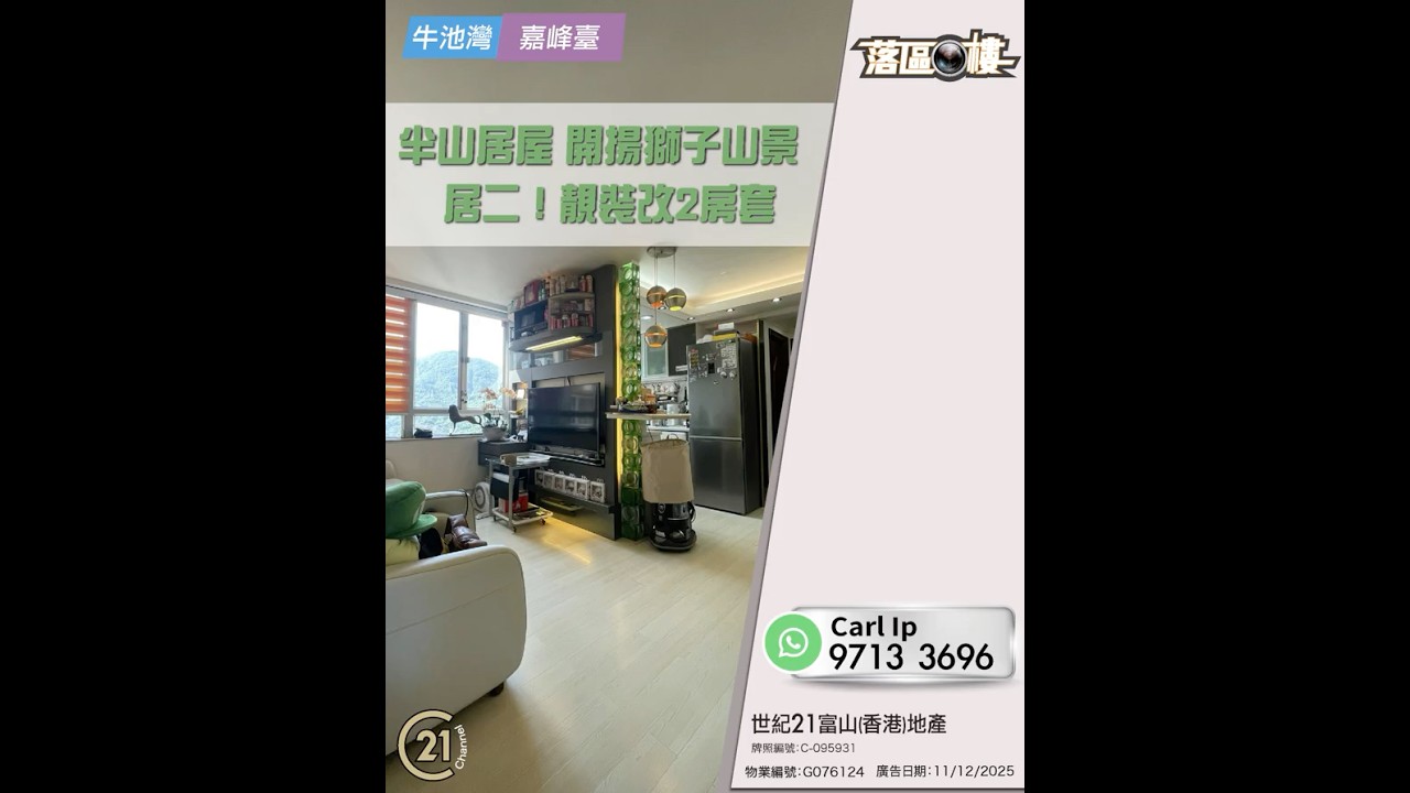 落區睇樓 🏠 九龍半山居屋,坐擁翠綠山景!居二靚裝,原則3房1套,改成大2房1套2廳,間隔實用又寬敞,望開揚翠綠山景及獅子山,環境優靜! 👉🏻 https://url.c21.hk/G076124 牛池灣 嘉峰臺 實用面積:592呎 電話號碼:📞9713 3696 (Carl Ip) 世紀21富山(香港)地產 牌照編號:C-095931 物業編號:G076124 廣告日期:11/12/2025 📲whatsapp查詢:https://url.c21.hk/wts #牛池灣 #嘉峰臺 #黃大仙 #居屋 #居二 #獅子山 #二手樓盤 #落區睇樓 #一手 #二手 #上車 #租務 #世紀21香港 #世紀21 #C21 #Century21 #21channel #21頻道 ---------------------------------------------------- 📍設定「搶先看」樓盤資訊即時收看📍 🔎世紀21香港官網 👉 https://c21.hk/ 🖥世紀21香港Facebook👉 https://url.c21.hk/fb 📞聯絡查詢:28697221 🔻讚好🔻訂閱🔻分享🔻LIKE🔻FOLLOW🔻SHARE ---------------------------------------------------- *以上的樓盤資料,由特許經營商提供及擁有,而每辦事處乃獨立擁有及經營(Each CENTURY 21 Office Is Independently Owned and Operated)。由於資料並非實時同步擷取,不確保樓盤廣告能反映樓盤的最新狀態,只僅作參考用途。若有錯漏而引致任何不便及損失,請直接向有關特許經營商或分行查詢,世紀21香港概不負責。