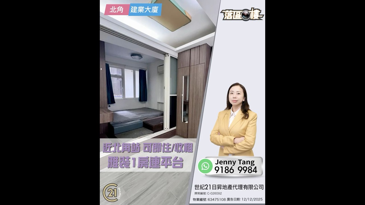 落區睇樓 🏠 有裝修有傢俱可即住!雅裝1房連約600呎大平台,間隔方正,鄰近北角站及港島東CBD,自住收租佳宜! 👉🏻 https://url.c21.hk/63475108 北角 建業大廈 實用面積:231呎 電話號碼:📞9186 9984 (Jenny Tang) 世紀21日昇地產代理有限公司 牌照編號:C-026092 物業編號:63475108 廣告日期:12/12/2025 📲whatsapp查詢:https://url.c21.hk/wts #北角 #建業大廈 #平台 #港島東CBD #二手樓盤 #落區睇樓 #一手 #二手 #上車 #租務 #世紀21香港 #世紀21 #C21 #Century21 #21channel #21頻道 ---------------------------------------------------- 📍設定「搶先看」樓盤資訊即時收看📍 🔎世紀21香港官網 👉 https://c21.hk/ 🖥世紀21香港Facebook👉 https://url.c21.hk/fb 📞聯絡查詢:28697221 🔻讚好🔻訂閱🔻分享🔻LIKE🔻FOLLOW🔻SHARE ---------------------------------------------------- *以上的樓盤資料,由特許經營商提供及擁有,而每辦事處乃獨立擁有及經營(Each CENTURY 21 Office Is Independently Owned and Operated)。由於資料並非實時同步擷取,不確保樓盤廣告能反映樓盤的最新狀態,只僅作參考用途。若有錯漏而引致任何不便及損失,請直接向有關特許經營商或分行查詢,世紀21香港概不負責。