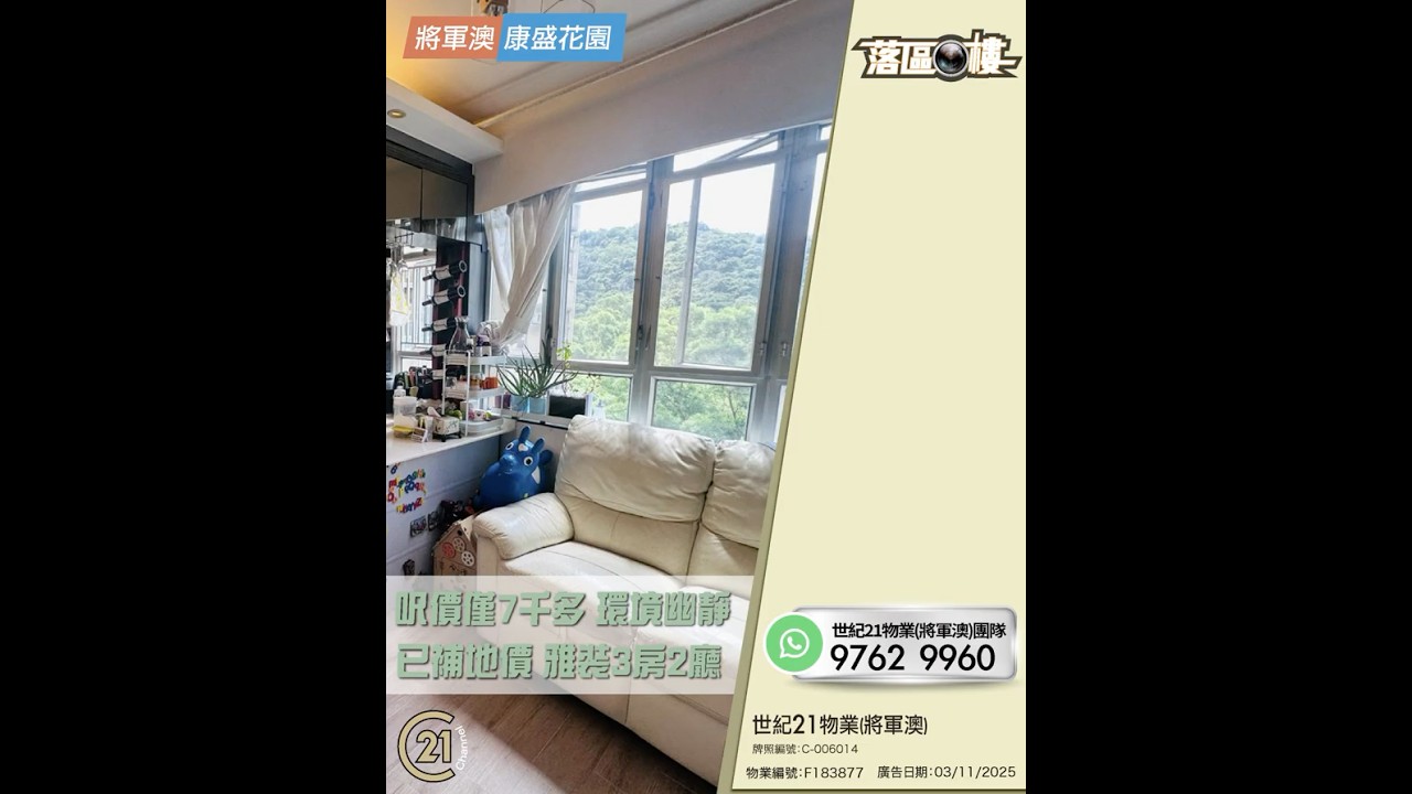 落區睇樓 🏠 呎價僅7千多,已補地價居屋,雅裝3房2廳,望開揚翠綠山景,環境清靜又舒服! 👉🏻 https://url.c21.hk/F183877 將軍澳 康盛花園 實用面積:592呎 電話號碼:📞9762 9960 ( 世紀21物業(將軍澳)團隊 ) 世紀21物業(將軍澳) 牌照編號:C-006014 物業編號:F183877 廣告日期:03/11/2025 📲whatsapp查詢:https://url.c21.hk/wts #將軍澳 #康盛花園 #已補地價 #居屋 #山景 #二手樓盤 #落區睇樓 #一手 #二手 #上車 #租務 #世紀21香港 #世紀21 #C21 #Century21 #21channel #21頻道 ---------------------------------------------------- 📍設定「搶先看」樓盤資訊即時收看📍 🔎世紀21香港官網 👉 https://c21.hk/ 🖥世紀21香港Facebook👉 https://url.c21.hk/fb 📞聯絡查詢:28697221 🔻讚好🔻訂閱🔻分享🔻LIKE🔻FOLLOW🔻SHARE ---------------------------------------------------- *以上的樓盤資料,由特許經營商提供及擁有,而每辦事處乃獨立擁有及經營(Each CENTURY 21 Office Is Independently Owned and Operated)。由於資料並非實時同步擷取,不確保樓盤廣告能反映樓盤的最新狀態,只僅作參考用途。若有錯漏而引致任何不便及損失,請直接向有關特許經營商或分行查詢,世紀21香港概不負責。