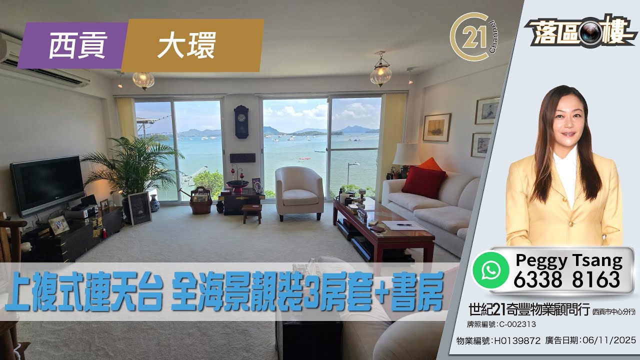 落區睇樓 🏠 上複式連天台特式戶,靚裝3房1套2廳,再加書房,空間實用又寬敞,享全海景,環境優美! 👉🏻 https://url.c21.hk/H0139872 西貢 大環 建築面積:1240呎 電話號碼:📞6338 8163 ( Peggy Tsang ) 世紀21奇豐物業顧問行 (西貢市中心分行) 牌照編號:C-002313 物業編號:H0139872 廣告日期:06/11/2025 📲whatsapp查詢:https://url.c21.hk/wts #西貢 #大環 #上複式 #天台 #海景 #二手樓盤 #落區睇樓 #一手 #二手 #上車 #租務 #世紀21香港 #世紀21 #C21 #Century21 #21channel #21頻道 ---------------------------------------------------- 📍設定「搶先看」樓盤資訊即時收看📍 🔎世紀21香港官網 👉 https://c21.hk/ 🖥世紀21香港Facebook👉 https://url.c21.hk/fb 📞聯絡查詢:28697221 🔻讚好🔻訂閱🔻分享🔻LIKE🔻FOLLOW🔻SHARE ---------------------------------------------------- *以上的樓盤資料,由特許經營商提供及擁有,而每辦事處乃獨立擁有及經營(Each CENTURY 21 Office Is Independently Owned and Operated)。由於資料並非實時同步擷取,不確保樓盤廣告能反映樓盤的最新狀態,只僅作參考用途。若有錯漏而引致任何不便及損失,請直接向有關特許經營商或分行查詢,世紀21香港概不負責。