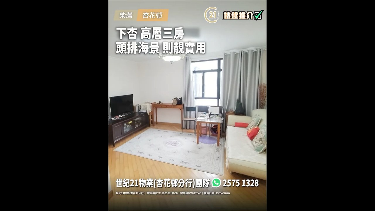 樓盤推介:下杏 高層三房 頭排海景 則靚實用 | 柴灣 杏花邨 柴灣 杏花邨27座 (售) 實用面積: 643 呎 查詢: 2575 1328 (世紀21物業(杏花邨分行)團隊) 更多物業資訊: https://url.c21.hk/017649 世紀21物業(杏花邨分行) 牌照編號: C-102992-A000 物業編號: 017649 廣告日期: 13/04/2026 📲whatsapp查詢:https://url.c21.hk/wts #柴灣 #杏花邨 #下杏 #3房 #售盤 #海景 #杏花新城 #港鐵站 #二手樓盤 #落區睇樓 #一手 #二手 #上車 #租務 #收租 #世紀21香港 #世紀21 #C21 #Century21 #21channel #21頻道 ======================================= 世紀21香港官網:https://c21.hk/ 世紀21香港Facebook專頁:https://url.c21.hk/fb 世紀21按揭計算機:https://url.c21.hk/mortgagecaulator --------------------------------------------------- *以上的樓盤資料,由特許經營商提供及擁有,而每辦事處乃獨立擁有及經營(Each CENTURY 21 Office Is Independently Owned and Operated)。由於資料並非實時同步擷取,不確保樓盤廣告能反映樓盤的最新狀態,只僅作參考用途。若有錯漏而引致任何不便及損失,請直接向有關特許經營商或分行查詢,世紀21香港概不負責。 =======================================