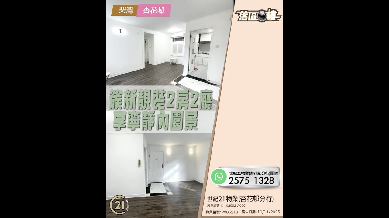 落區睇樓 🏠 自成一隅,屋苑有地鐵站又有商場,而且單位近巴士站及地鐵站,更加便利!雅裝2房2廳連露台,廳大房大 👉🏻 https://url.c21.hk/021770 柴灣 杏花邨 實用面積:547呎 電話號碼:📞2575 1328 ( 世紀21物業(杏花邨分行)團隊 ) 世紀21物業(杏花邨分行) 牌照編號:C-102992-A000 物業編號:021770 廣告日期:04/11/2025 📲whatsapp查詢:https://url.c21.hk/wts #柴灣 #杏花邨 #露台 #自成一隅 #二手樓盤 #落區睇樓 #一手 #二手 #上車 #租務 #世紀21香港 #世紀21 #C21 #Century21 #21channel #21頻道 ---------------------------------------------------- 📍設定「搶先看」樓盤資訊即時收看📍 🔎世紀21香港官網 👉 https://c21.hk/ 🖥世紀21香港Facebook👉 https://url.c21.hk/fb 📞聯絡查詢:28697221 🔻讚好🔻訂閱🔻分享🔻LIKE🔻FOLLOW🔻SHARE ---------------------------------------------------- *以上的樓盤資料,由特許經營商提供及擁有,而每辦事處乃獨立擁有及經營(Each CENTURY 21 Office Is Independently Owned and Operated)。由於資料並非實時同步擷取,不確保樓盤廣告能反映樓盤的最新狀態,只僅作參考用途。若有錯漏而引致任何不便及損失,請直接向有關特許經營商或分行查詢,世紀21香港概不負責。